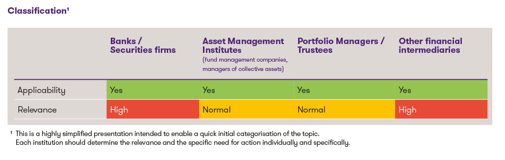 - Subjection to the FinSA: Certain already known provisions of the FinSA relating to customer protection may apply in whole or in part, depending on the specific nature of the business activity. Further details can be found in the chapter "Impact on market participants".