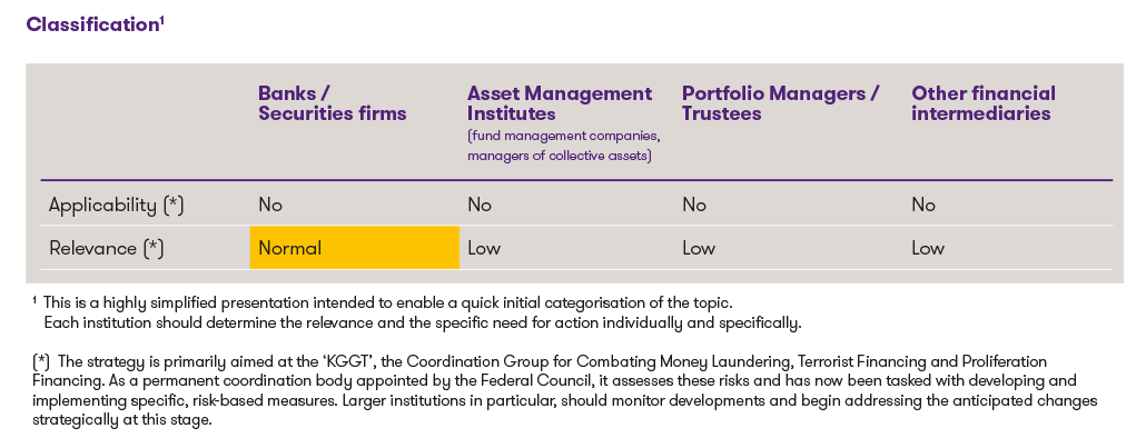 (*) The strategy is primarily aimed at the ‘KGGT’, the Coordination Group for Combating Money Laundering, Terrorist Financing and Proliferation Financing. As a permanent coordination body appointed by the Federal Council, it assesses these risks and has now been tasked with developing and implementing specific, risk-based measures. Larger institutions in particular, should monitor developments and begin addressing the anticipated changes strategically at this stage.